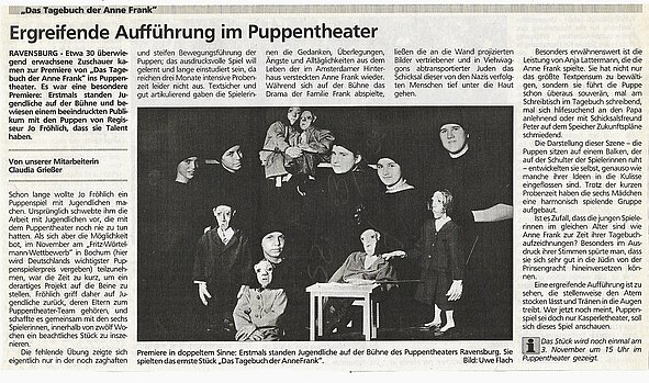 Vereinsgründung Puppenspielkiste Ravensburg e.V.. Im Vorstand sind Ottokar Seifert (1.Vorsitzender), Marian Vlasak (2.Vorsitzender) und Ulrich Schlotter als Beisitzer. Im Verein sind 16 aktive Mitspieler sowie 38 passive Mitglieder.